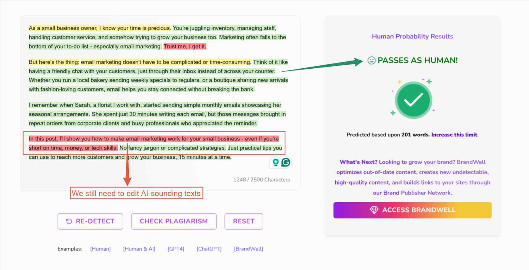 I also copy-pasted the content that I generated into BrandWell’s AI content detector to check if AI wrote it, and you can see the results below,