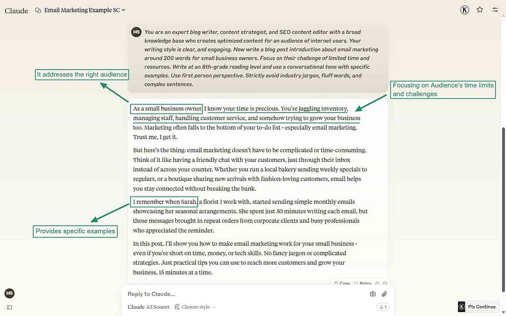 Think of it like briefing a writing assistant. You wouldn’t just say “Write about email marketing” – you’d provide specific details about the angle, audience, and desired outcome.